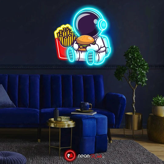 Astronaut Chillin with Burger UV Neon Sign – Brighten Your Space with Cosmic Vibes!