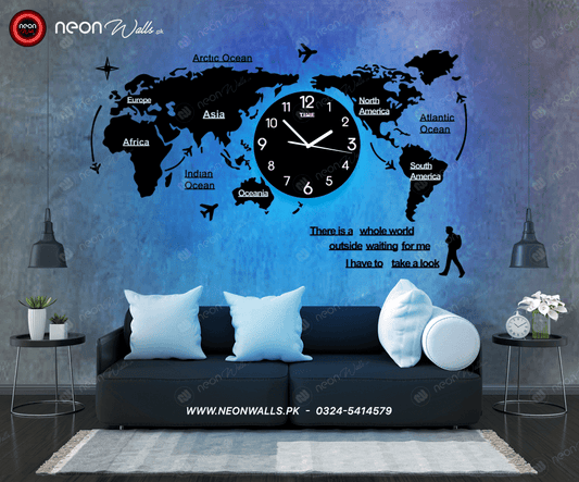World Map Wall Clock with Neon Light (Large)